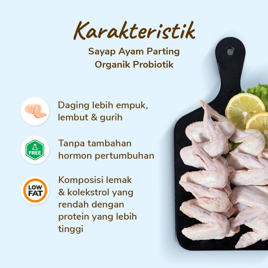Origin : Local/Indonesia Fat Ratio : +/- 19.5 gram lemak per 100 gram Gramation : 500 gram Glazing : 5-10% Part : Sayap Ayam Item Size : P 25, L 20, T 5 cm Item pcs/packs : 8 - 12 pcs Packaging : Non Vacuum with PI 0.7mm Sayap Ayam Organik 500 gram adalah potongan ayam segar berkualitas tinggi yang berasal dari ayam organik yang dipelihara tanpa antibiotik, hormon, atau bahan kimia sintetis. Dagingnya lebih empuk, juicy, dan memiliki cita rasa alami khas ayam sehat. Cocok untuk berbagai olahan seperti goreng, panggang, sup, atau sambal. Produk ini dikemas higienis agar tetap segar dan aman dikonsumsi. Pilihan tepat untuk sumber protein sehat keluarga yang ingin menikmati ayam organik alami dan halal setiap hari.